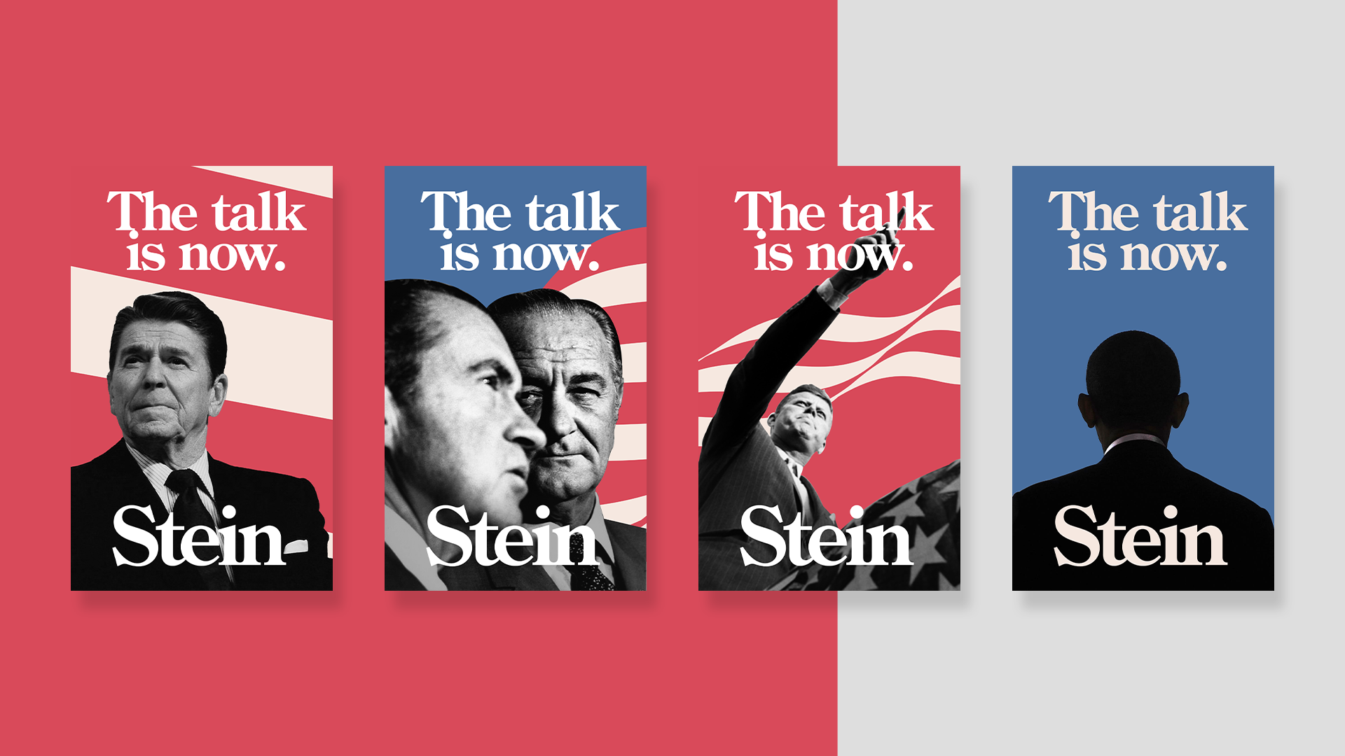 During the discovery, I came across Ronald Reagan's 1980 print campaign. Although he may have been a catalyst for modern wealth inequality, corporate greed, and one of the most harmful figures in Black American society post Jim Crow, his posters and the nostalgic visual appeal were ELITE. "The talk is now" is merely a play off of his campaign slogan "The time is now". The goal of this direction was to evoke nostalgia for boomers through references to his earlier campaigns via typefaces and slogans, while also revitalizing interest for millennials and Gen-Z with big colors in a brutalist aesthetic.